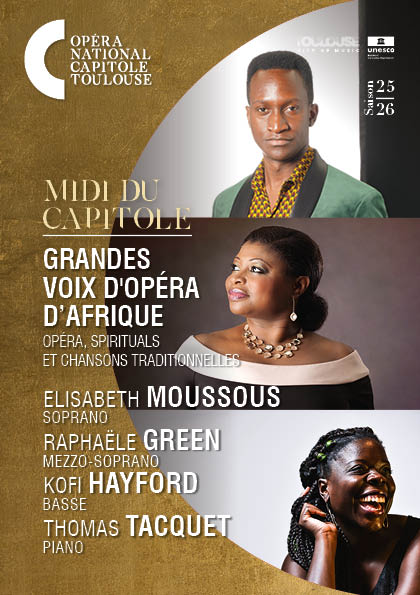 Cette séance, en partenariat avec Africa Lyric’s Opera – initiative de l’ONG Women of Africa dédiée à la promotion des artistes lyriques africains et afro-descendants –, réunit trois voix remarquables : la soprano Elisabeth Moussous (Cameroun), la mezzo-soprano Raphaële Green (Congo) et la basse Kofi Hayford (Ghana), accompagnés au piano par Thomas Tacquet.